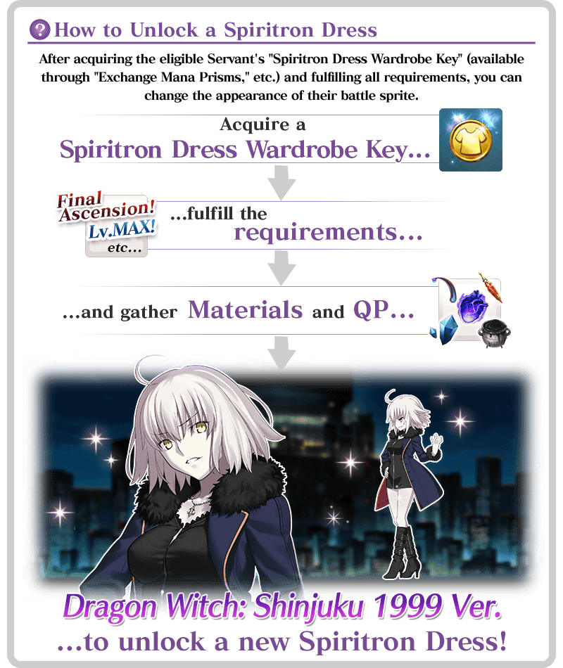 * Upon unlocking a Spiritron Dress, the Servant's battle sprite and icons will automatically change to match it. You can revert back to the original appearance or change to a different Ascension level from the Servant Details screen.