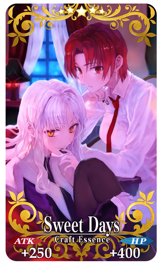 ★★★★★SSR Sweet Days ATK 250 (MAX: 1000) HP 400 (MAX: 1600) Skill Increase Arts Card & Buster Card effectiveness by 8% & gain 3 C. Stars each turn for yourself + Increase Flavor Boost amount per drop by 2 [Event Only]
