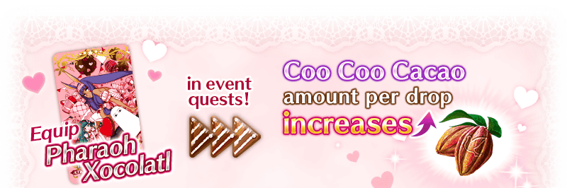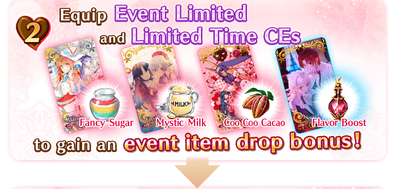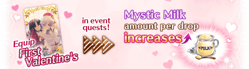 Equip the Limited Time Craft Essences available through the Valentine’s 2020 Pickup Summon (Daily) to gain a bonus to the amount of event items “Coo Coo Cacao,” “Mystic Milk,” or “Fancy Sugar” per drop!