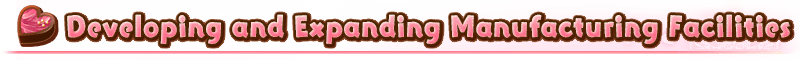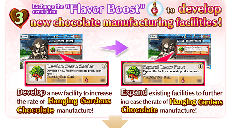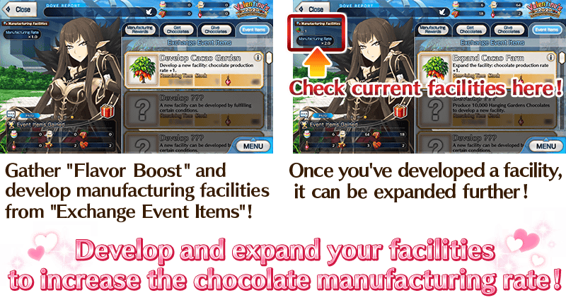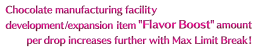 The more your chocolate manufacturing rate increases, the more chocolate you will acquire when you clear event quests. Fulfill the requirements to expand and develop your facilities, and manufacture more chocolate more efficiently!