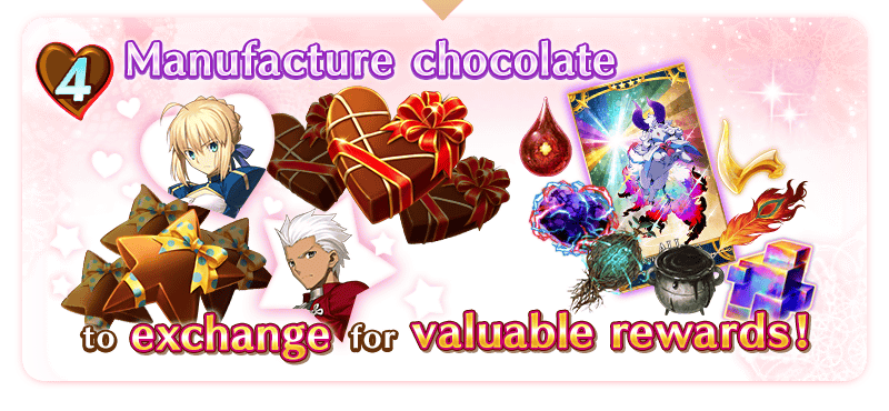 Manufacture chocolate through event quests, acquire the event item “Lock-On Chocolate,” and receive special Valentine’s gifts from your favorite Servants!