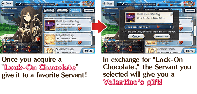 * “Lock-On Chocolate” exchange will only be possible with Servants that you have summoned in the past.