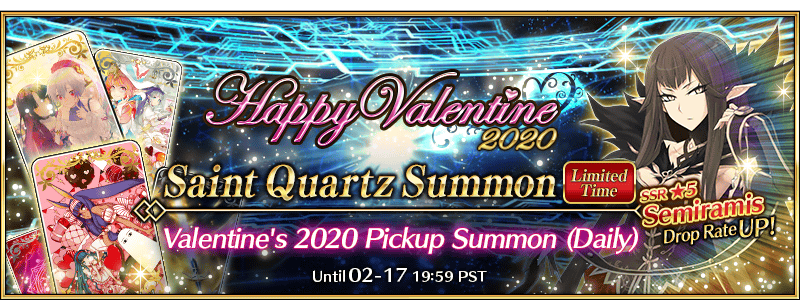New Servant Semiramis, as well as Limited Time Craft Essences which will grant useful bonuses within this event, can be summoned through the Valentine’s 2020 Pickup Summon (Daily)! Please see the link below for more details.