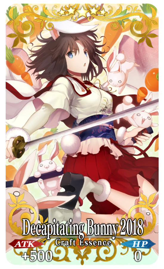 Decapitating Bunny 2018 ATK 500 (MAX: 2000) HP 0 Skill Apply Ignore Invincible & increase Quick card effectiveness by 8% for yourself + increase appearance rate of [Vengeful Spirit of Seven People] enemies by 25% [Event Only]