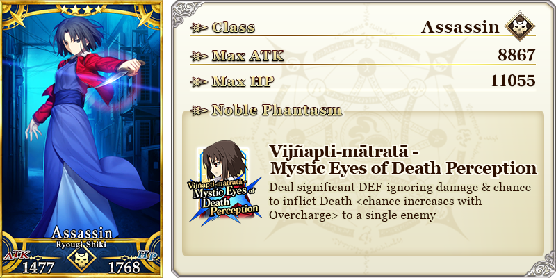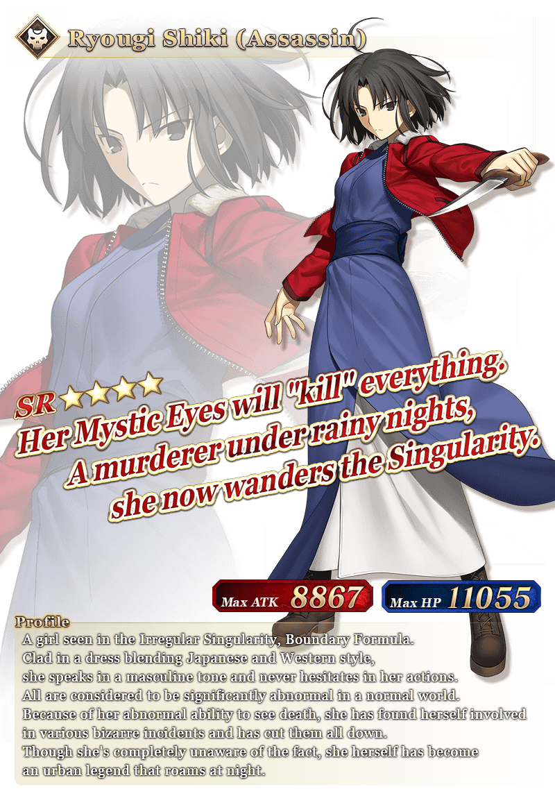 See "★4 (SR) Ryougi Shiki (Assassin)" in action on YouTube, where we're sharing an exclusive video of her Noble Phantasm!