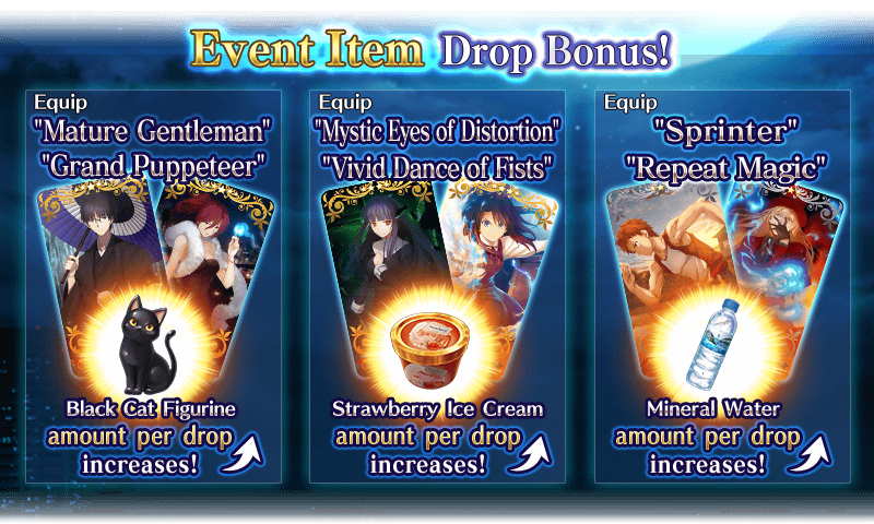Equip the Limited Time Craft Essences "Mature Gentleman," "Grand Puppeteer," "Mystic Eyes of Distortion," "Vivid Dance of Fists," "Sprinter," and "Repeat Magic," available through the ongoing Pickup Summon, to gain a bonus to the amount per drop for the event items Black Cat Figurine, Strawberry Ice Cream, or Mineral Water!