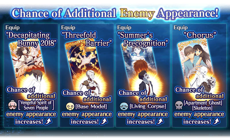 Some event missions will require you to defeat a certain number of one type of enemy. Equip the Event Limited Craft Essences "Decapitating Bunny 2018," "Threefold Barrier," "Summer's Precognition," and "Chorus" to increase the chance that additional enemies of a certain type will appear in battle!