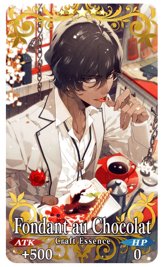 ★★★★★SSR Fondant au Chocolat ATK 500 (MAX: 2000) HP 0 Skill Apply 25% Special Attack [Divine] & begin battle with NP charged at 30% for yourself |