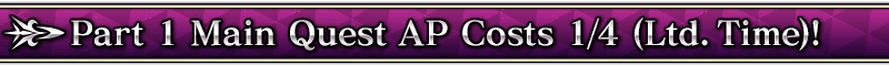 On top of the permanent half AP cost for Part 1 story quests, AP costs will be further halved for a limited time! During the period below, AP costs for Part 1 story quests (Singularity F - Final Singularity) will be 1/4 of the original amount!