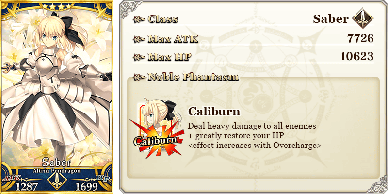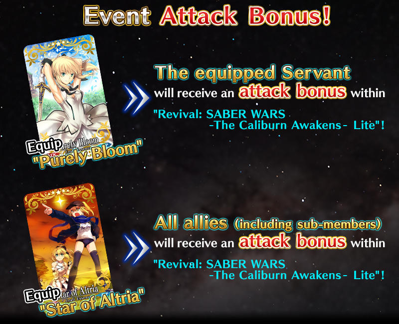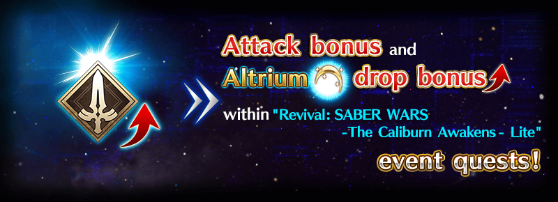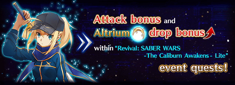 All Saber-class Servants will receive an attack bonus and a bonus to the amount of Altrium per drop within “Revival: SABER WARS - The Caliburn Awakens - Lite.”