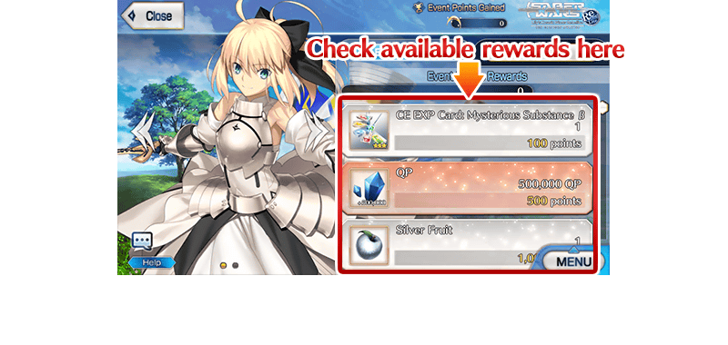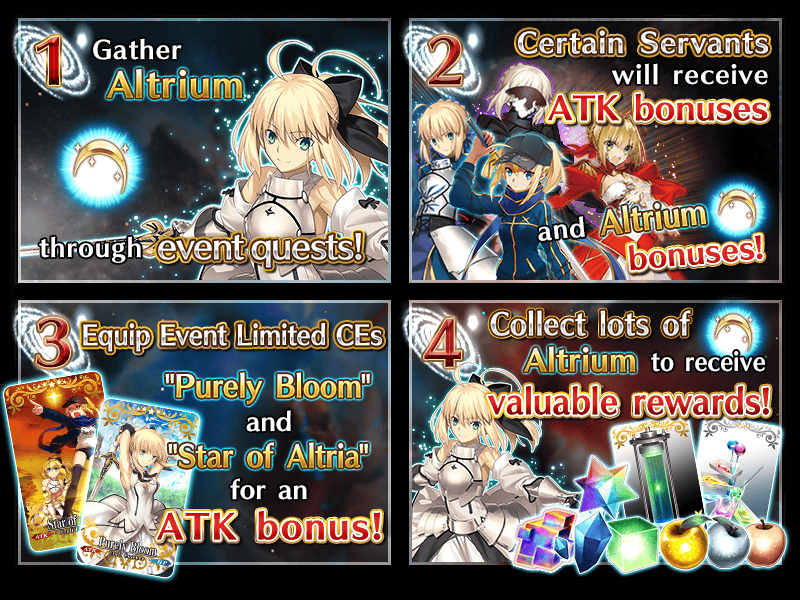 Equip the Event Limited Craft Essences “Purely Bloom” and “Star of Altria,” available as Event Points Rewards and through event item exchange, to receive an attack bonus within event quests.