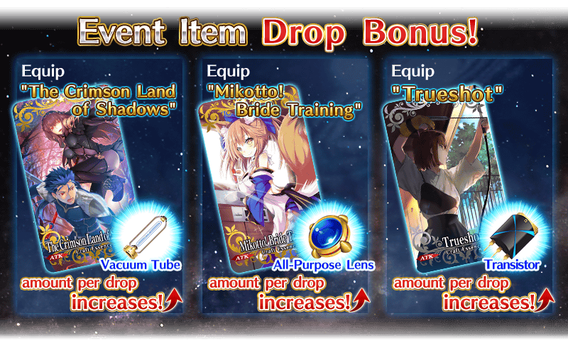 Equip the Limited Time Craft Essences “The Crimson Land of Shadows,” “Mikotto! Bride Training,” and “Trueshot,” available through the ongoing Pickup Summon, to receive a bonus to the amount of event items Vacuum Tube, All-Purpose Lens, and Transistor per drop.