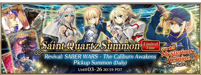 The Revival: SABER WARS - The Caliburn Awakens Pickup Summon (Daily) is also ongoing! See the link below for more details.