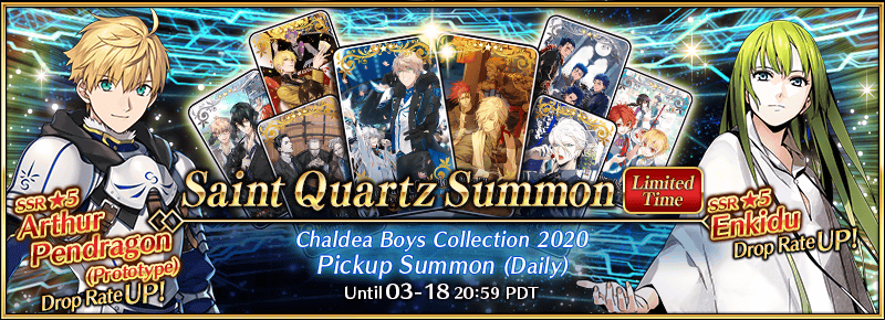 Don’t miss the Chaldea Boys Collection 2020 Pickup Summon (Daily)! Enkidu will be summonable with an increased drop rate from 2020-03-17 21:00 - 03-18 20:59 PDT!