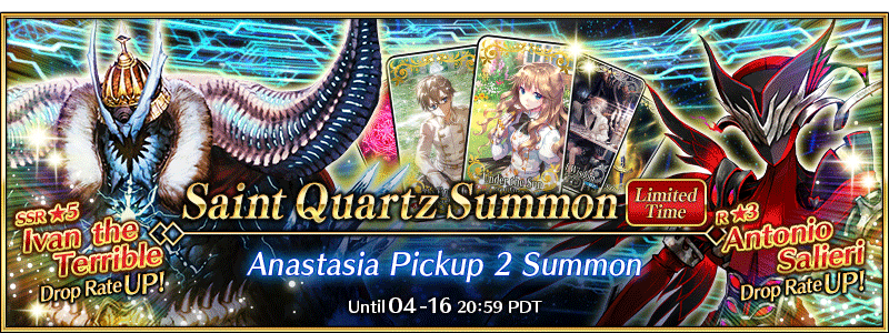 * Antonio Salieri will be summonable through the Anastasia Pickup 2 Summon even if he has not yet been added to Story Summon through story progression.