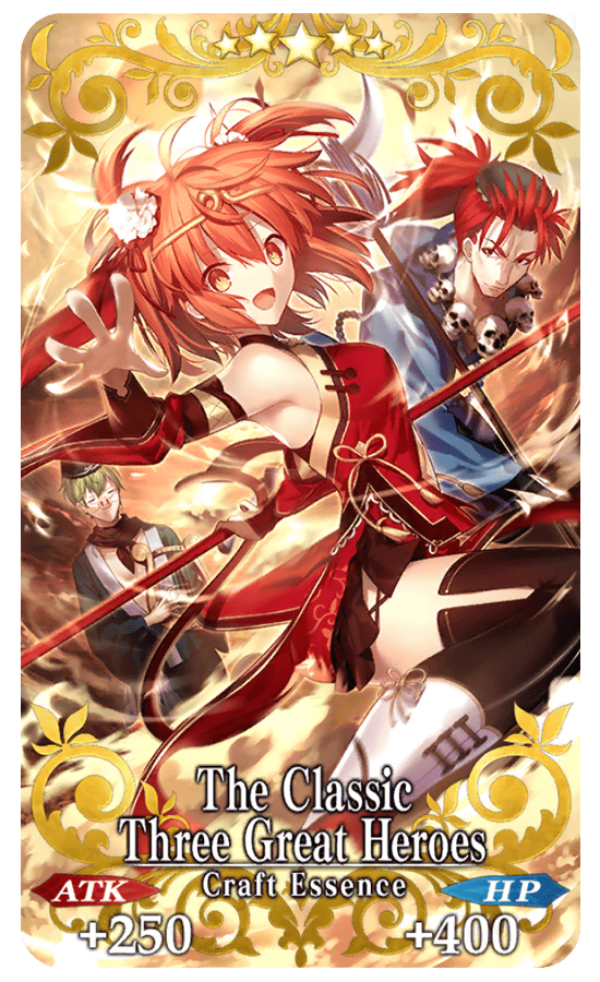 [Event Limited Craft Essences] ★5 (SSR) "The Classic Three Great Heroes" [Skill Enhancement & Ascension Materials] Lamp of Evil-Sealing Evil Bone Proof of Hero [Skill Enhancement Materials] Gem of Archer Gem of Lancer Gem of Caster Gem of Berserker [Other Items] Hero Crystal: Meteor Fou ALL ★4 (HP) Hero Crystal: Star Fou ALL ★3 (HP) Hero Crystal: Sun Fou ALL ★3 (ATK) Blaze of Wisdom ALL ★4 (SR) Fire of Wisdom ALL ★3 (R) Immortal Peach |