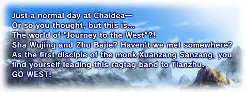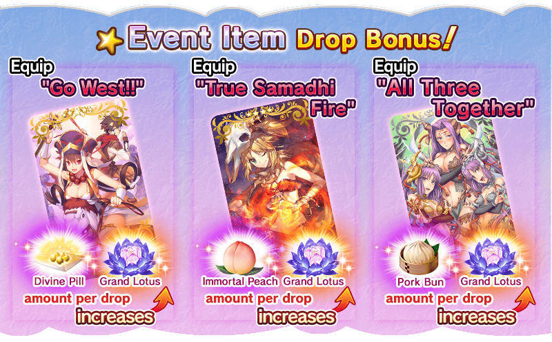 Equip the Limited Time Craft Essences "Go West!!," "True Samadhi Fire," and "All Three Together," available through the ongoing Pickup Summon, to gain a bonus to the amount of event items Divine Pill, Immortal Peach, Pork Bun, and Grand Lotus per drop within "Revival: Sanzang Coming to the West - Lite" event quests.