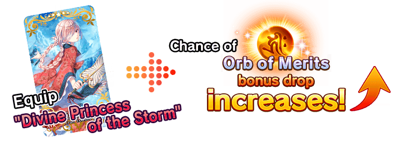 Equip the Event Limited Craft Essences "The Classic Three Great Heroes" and "Divine Princess of the Storm," available through Event Item Exchange, to receive a bonus within "Revival: Sanzang Coming to the West - Lite" event quests! "The Classic Three Great Heroes" will increase the amount of Talisman of Merits per drop, and "Divine Princess of the Storm" will increase the chance of extra Orb of Merits drops.