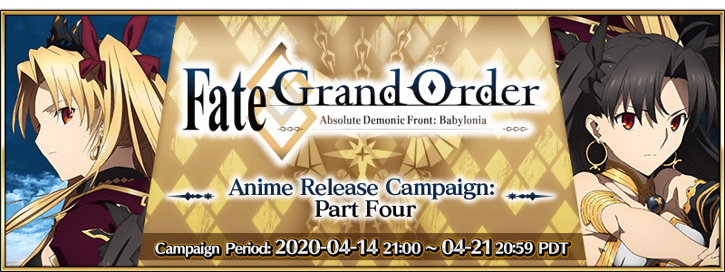To commemorate "'Fate/Grand Order Absolute Demonic Front: Babylonia' Anime Release Campaign: Part Four," we will be distributing special login bonuses. Log in six times (counted once per day) during the period below to receive a Campaign Limited Craft Essence and 12 Saint Quartz! Campaign Period: 2020-04-14 21:00 - 04-21 20:59 PDT * Log in for a total of six days during the campaign period to receive all login bonuses. |