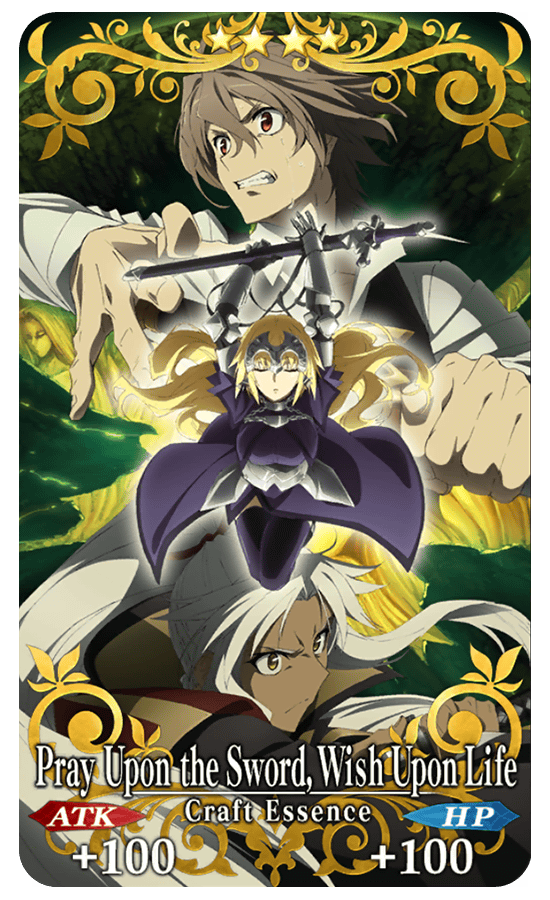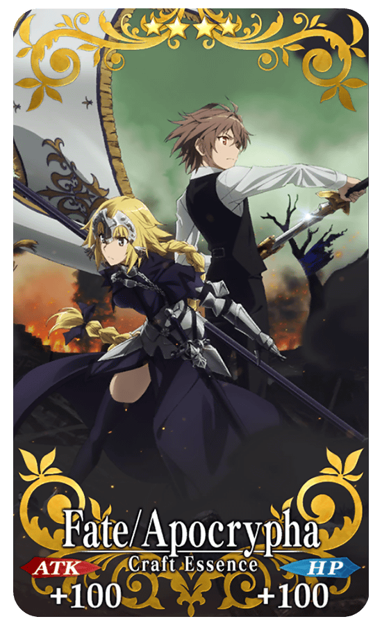 Fate/Apocrypha ATK 100 (MAX: 100) HP 100 (MAX: 100) Skill When a quest is completed, increase the amount of Mystic Code EXP gained by 50 |