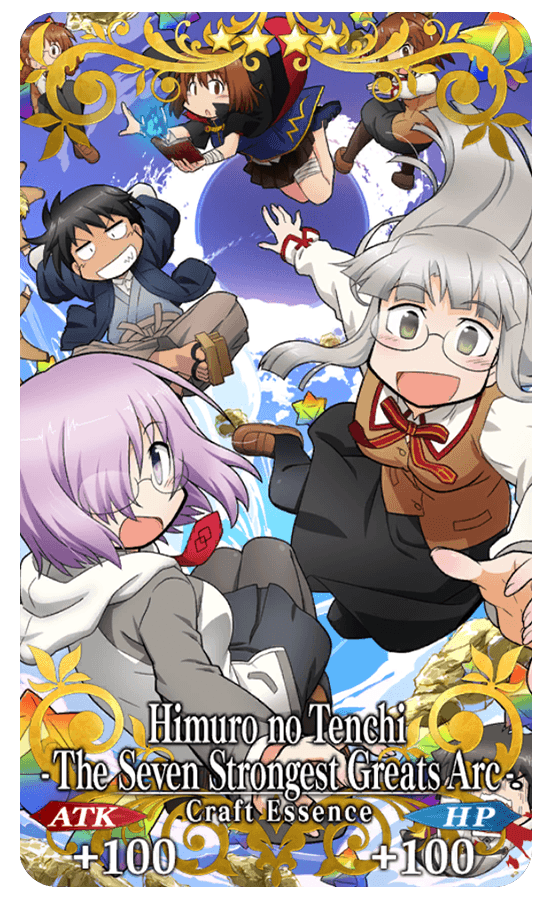 ★★★★SR Himuro no Tenchi - The Seven Strongest Greats Arc - ATK 100 (MAX: 100) HP 100 (MAX: 100) Skill When a quest is completed, increase the amount of Mystic Code EXP gained by 50 |