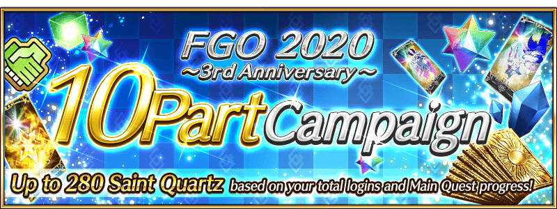 Distribution Period: 2020-07-06 21:00 - 07-13 20:59 PDT Rewards: Saint Quartz x30 Eligibility: All Masters who have cleared "Singularity F: Flame Contaminated City, Fuyuki" by 2020-07-06 20:59 PDT will be eligible to receive the rewards. |