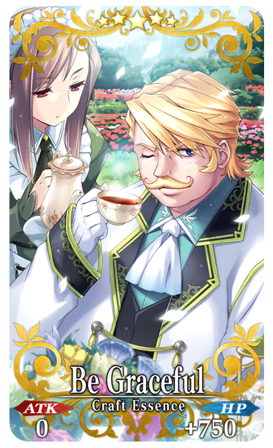 ★★★★★SSR Be Graceful ATK 0 HP 750 (MAX: 3000) Skill Increase Mystic Code EXP gained by 1% (3% if equipped as Support) |