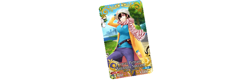 ★★★★SR Travel Portrait ATK 100 (MAX: 100) HP 100 (MAX: 100) Skill When a quest is completed, increase the amount of Mystic Code EXP gained by 50 * All stats are the same for each of the 39 "Travel Portraits." |