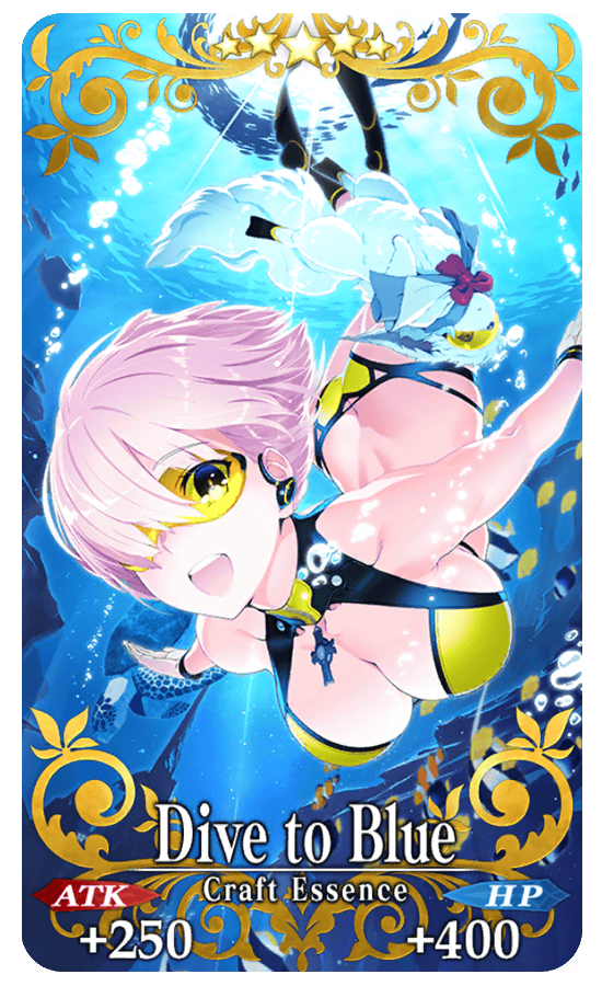 Equip the Event Limited Craft Essence "★5 (SSR) Dive to Blue," available through Event Item Exchange, to gain a drop bonus for the event items "Connacht Coin," "Instant Noodles," and "Single Candy" within the Limited Time Event "Revival: Death Jail Summer Escape - Medb's Prison of Sin and Despair 2019 - Lite."
