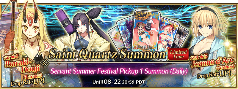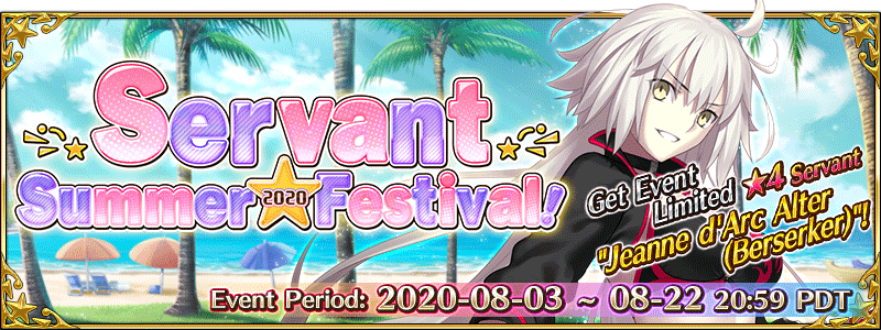 For more information about the Limited Time Event "Servant Summer Festival!" and how to acquire Event Limited Servant "★4 (SR) Jeanne d'Arc Alter (Berserker)," as well as information about the "Servant Summer Festival Pickup 1 Summon (Daily)," please see the banners linked below.
