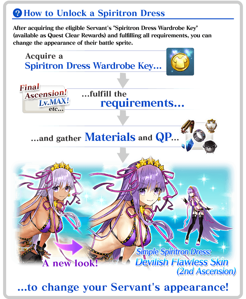 * Upon unlocking a Spiritron Dress, the Servant's battle sprite and icons will automatically be changed. You can revert back to the original appearance or change to a different Ascension level from the Servant Details screen.