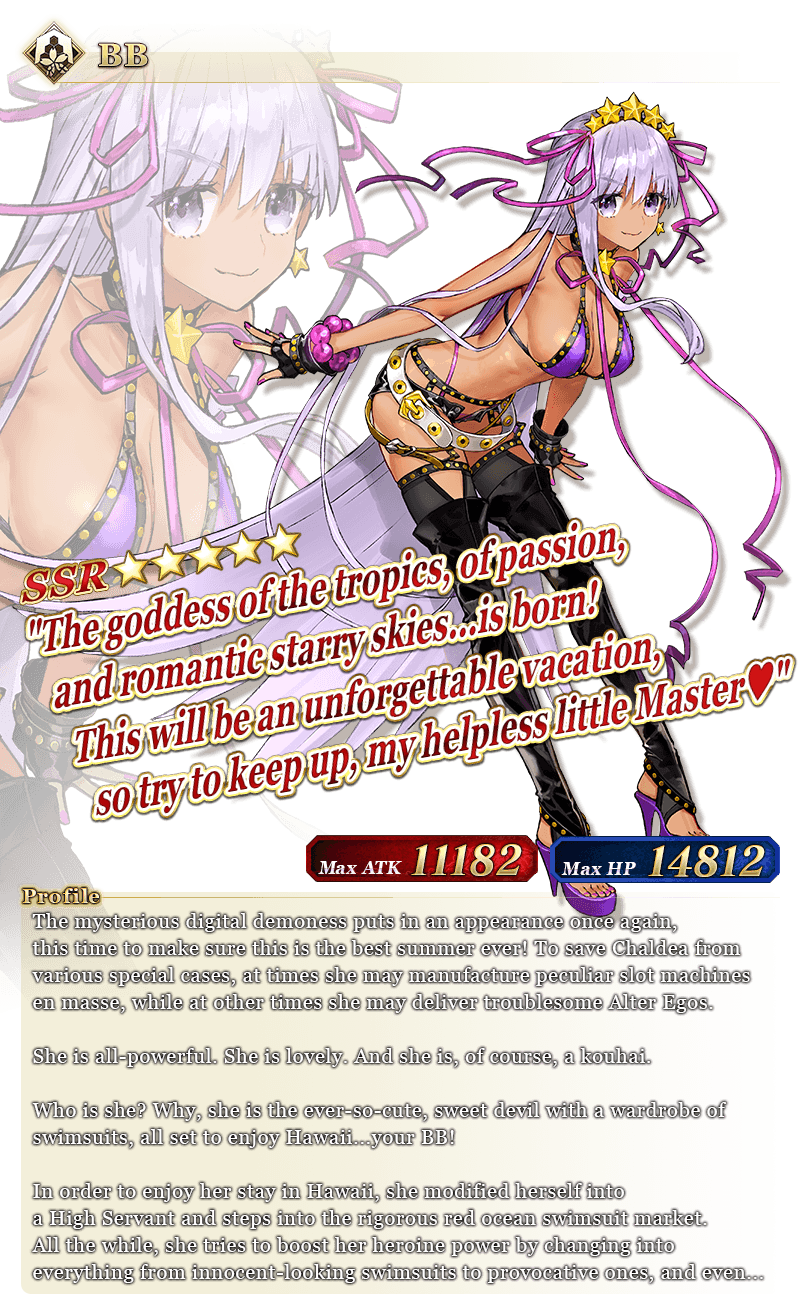 * ★5 (SSR) BB, ★4 (SR) Medb (Saber), and ★4 (SR) Mysterious Heroine XX (Foreigner) will not be added to Story Summon after the Pickup Summon period ends.