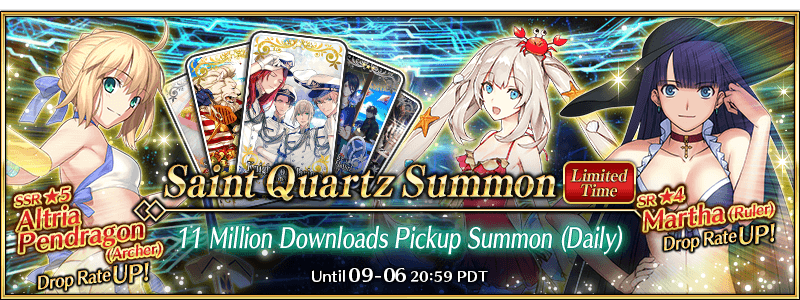 To celebrate 11 million downloads, "★5 (SSR) Altria Pendragon (Archer)," "★4 (SR) Marie Antoinette (Caster)," and "★4 (SR) Martha (Ruler)" return for a limited time!