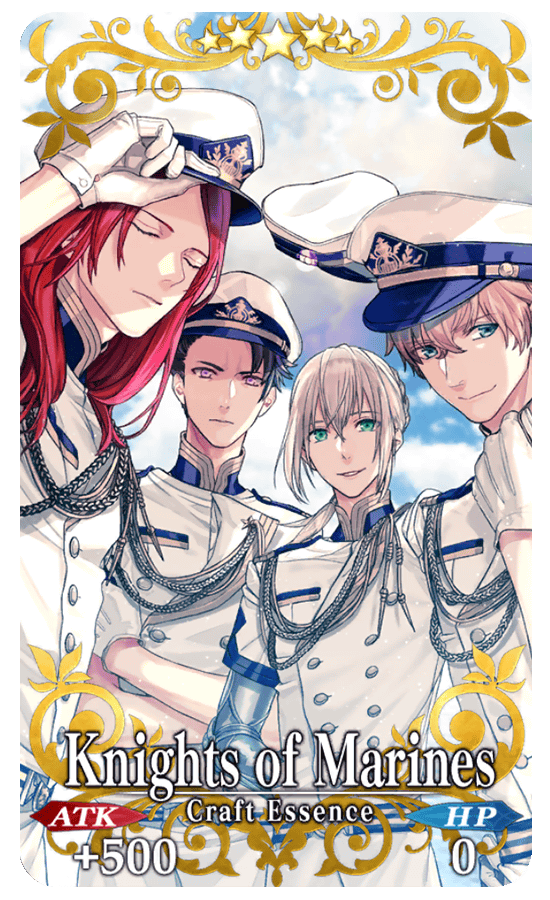★★★★★SSR Knights of Marines ATK 500 (MAX: 2000) HP 0 Skill Increase Quick Card effectiveness by 10% & begin battle with NP charged at 50% for yourself |
