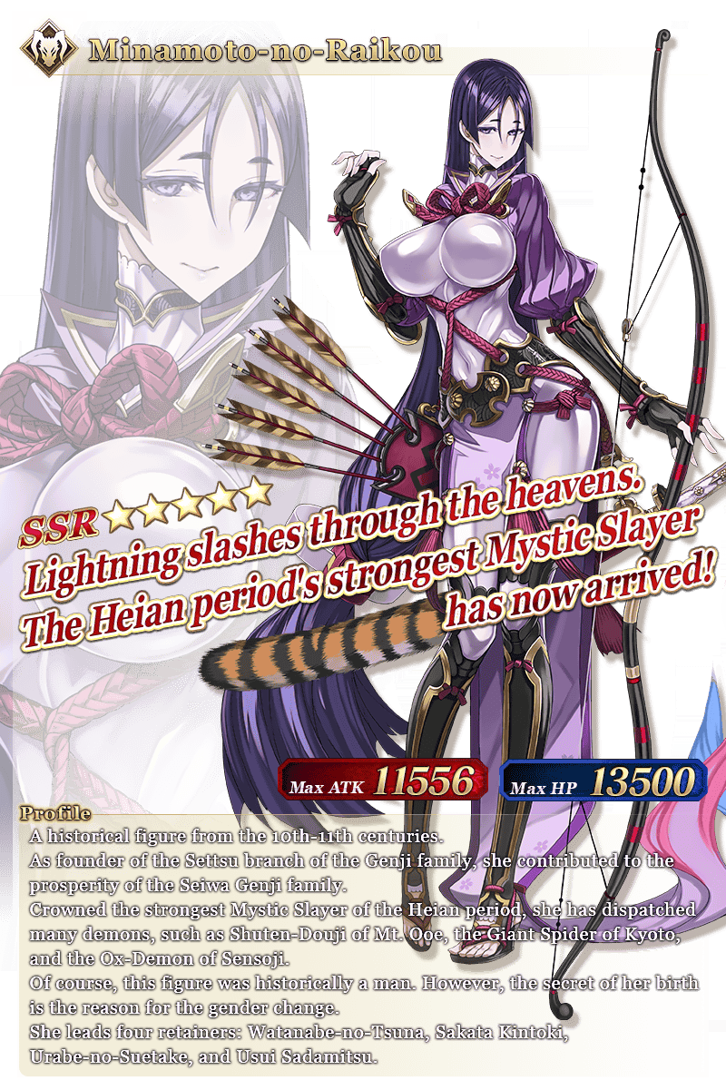 Limited Time Servants "★5 (SSR) Minamoto-no-Raikou (Berserker)" and "★5 (SSR) Shuten-Douji" will be featured on a daily rotation, while "★4 (SR) Yagyu Tajima-no-kami Munenori" and "★3 (R) Okada Izo" will be featured for the duration of the Pickup Summon!