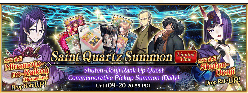 To commemorate the release of Shuten-Douji's Rank Up Quest, the "Shuten-Douji Rank Up Quest Commemorative Pickup Summon (Daily)" will be available for a limited time.