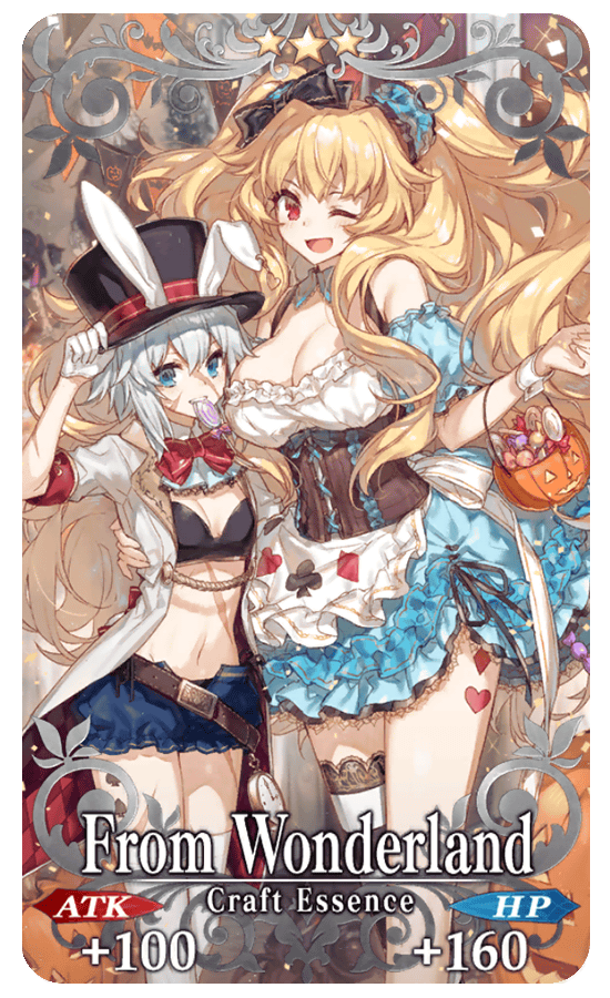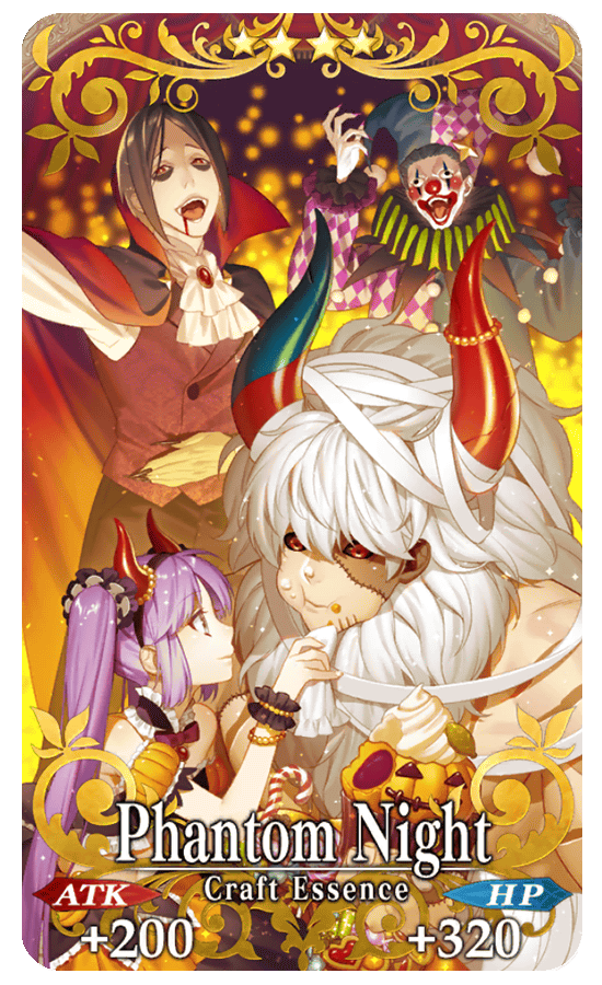 Equip the Limited Time Craft Essences "★5 (SSR) Trick or Treatment," "★4 (SR) Phantom Night," and "★3 (R) From Wonderland" to receive an event item drop bonus within the Limited Time Event!