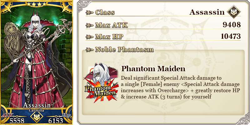 * Osakabehime, Elisabeth Báthory (Lancer), Carmilla, Assassin of Shinjuku, Assassin of the Nightless City, and Berserker of El Dorado will continue to be available through Story Summon after the Pickup Summon period ends.