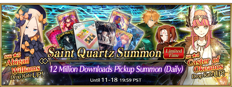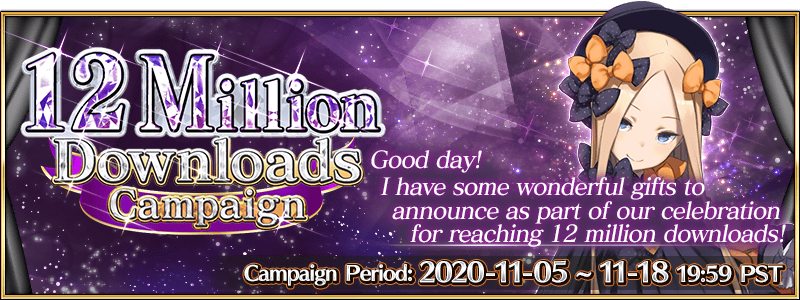 | We've prepared a special login bonus to commemorate the "12 Million Downloads Campaign". Log in for seven days in a row during the campaign period to receive 10 Summon Tickets (worth 10 Saint Quartz Summons) and other valuable rewards! Campaign Period: 2020-11-05 00:00 - 11-18 19:59 PST |