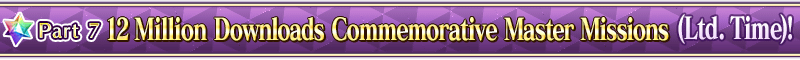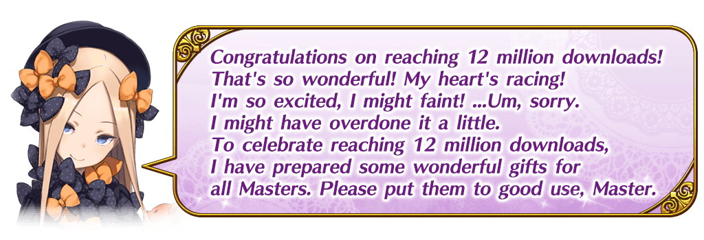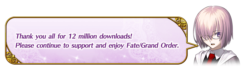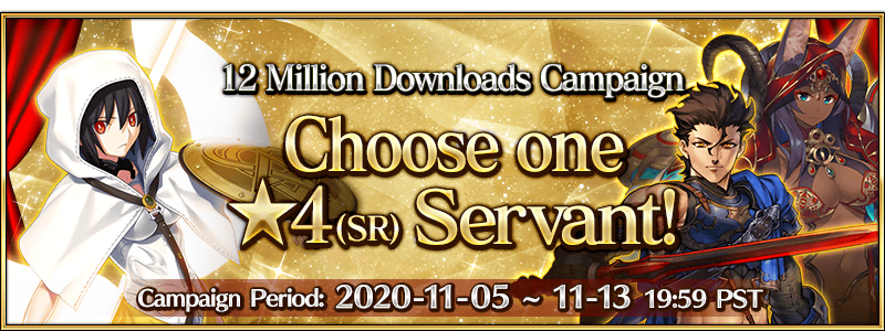 Log in during the period below to receive one "12 Million Downloads Celebration Ticket", exchangeable for one of 54 eligible ★4 (SR) Servants!