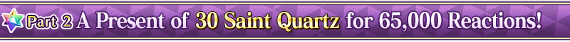 If you can get the campaign posts on the Fate/Grand Order Official Twitter and Facebook to a total of 65,000 combined Facebook Reactions/Shares and Twitter Likes/Retweets, we'll distribute 30 Saint Quartz (worth 10 Saint Quartz Summons) to all Masters!