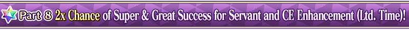 The chance of Super Success (double EXP acquired) and Great Success (triple EXP acquired) when performing Servant and Craft Essence Enhancement will be doubled for a limited time!