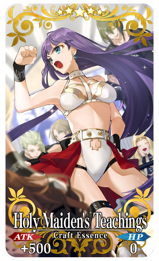 ★★★★★SSR Holy Maiden's Teachings ATK 500 (MAX: 2000) HP 0 Skill Increase Quick card effectiveness by 8% and Buster card effectiveness by 8% for yourself + Gain 15 C. Stars when entering the field for the first time (1 time) + Increase the amount of Amigo Towel per drop by 1 [Event Only]