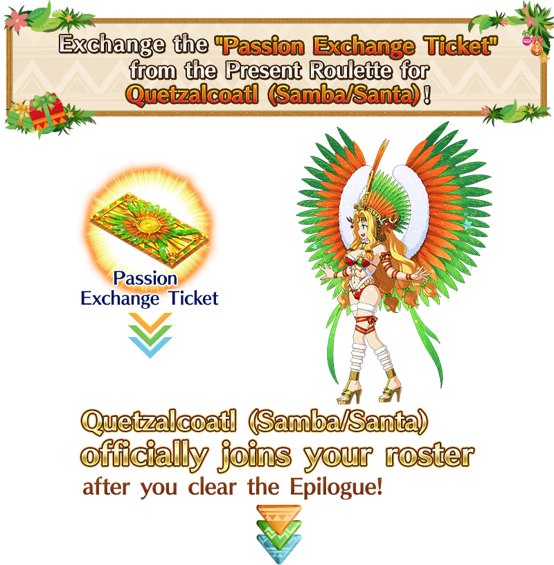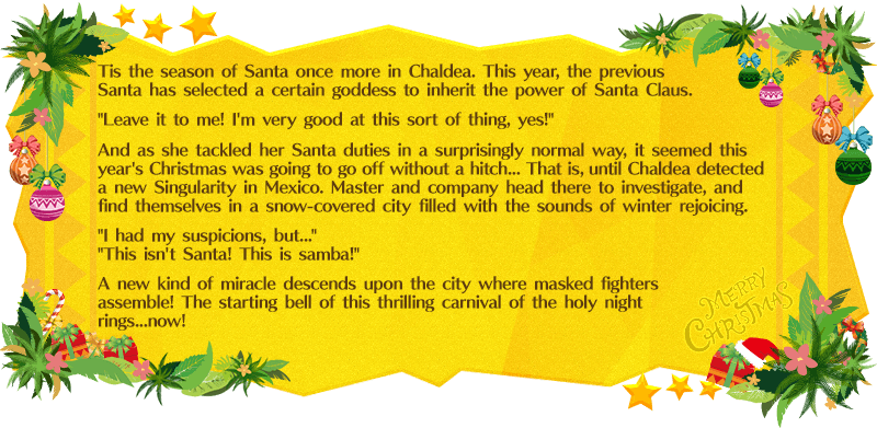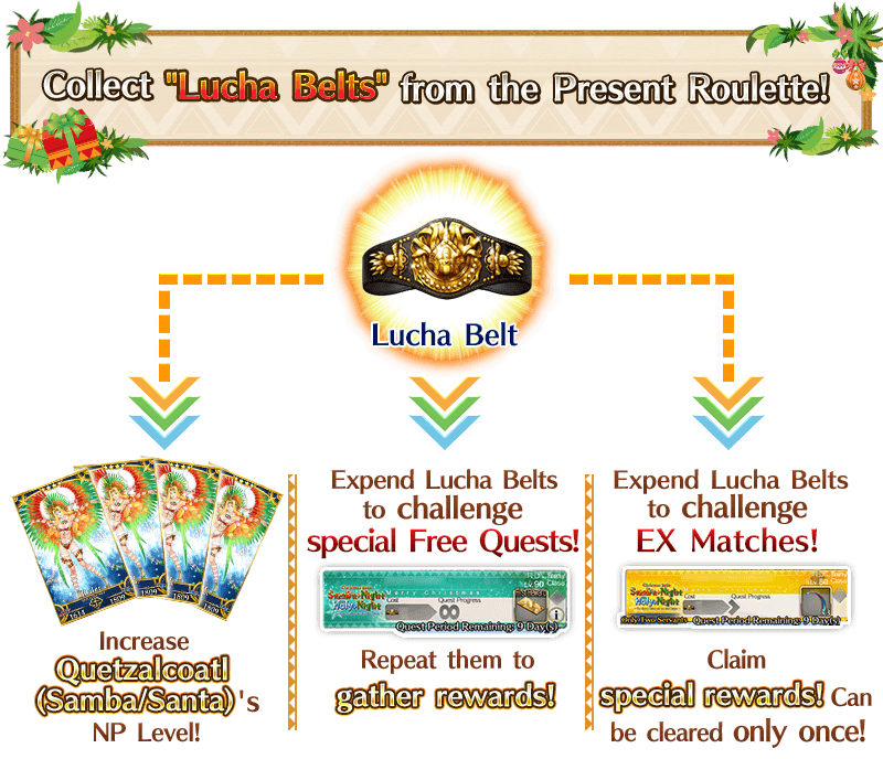 * Event item "Lucha Belt", included in each Present Lineup, can be exchanged for Quetzalcoatl (Samba/Santa) [For NP Enhancement], various materials, or to challenge special Free Quests.