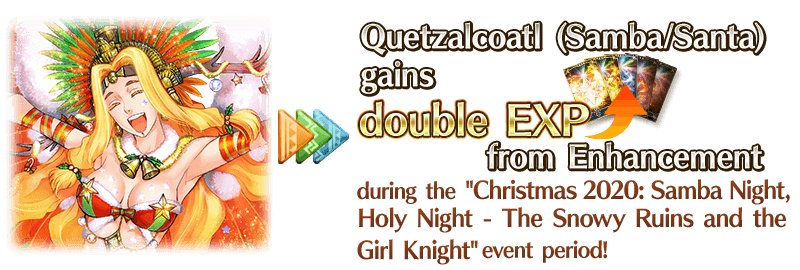 For the duration of the event period, "★4 (SR) Quetzalcoatl (Samba/Santa) (Ruler)" will receive double EXP when performing Enhancement.