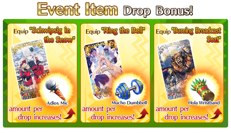 When you equip "Schwipsig in the Snow," "Ring the Bell," and "Burning Broadcast Seat," available through the ongoing Pickup Summon, you will gain a bonus to the amount per drop of event items "Adios Mic," "Mucho Dumbbell," and "Hola Wristband".