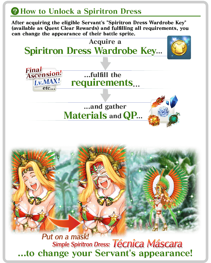 * Upon unlocking a Spiritron Dress, the Servant's battle sprite and icons will automatically be changed. You can revert back to the original appearance or change to a different Ascension level from the Servant Details screen.