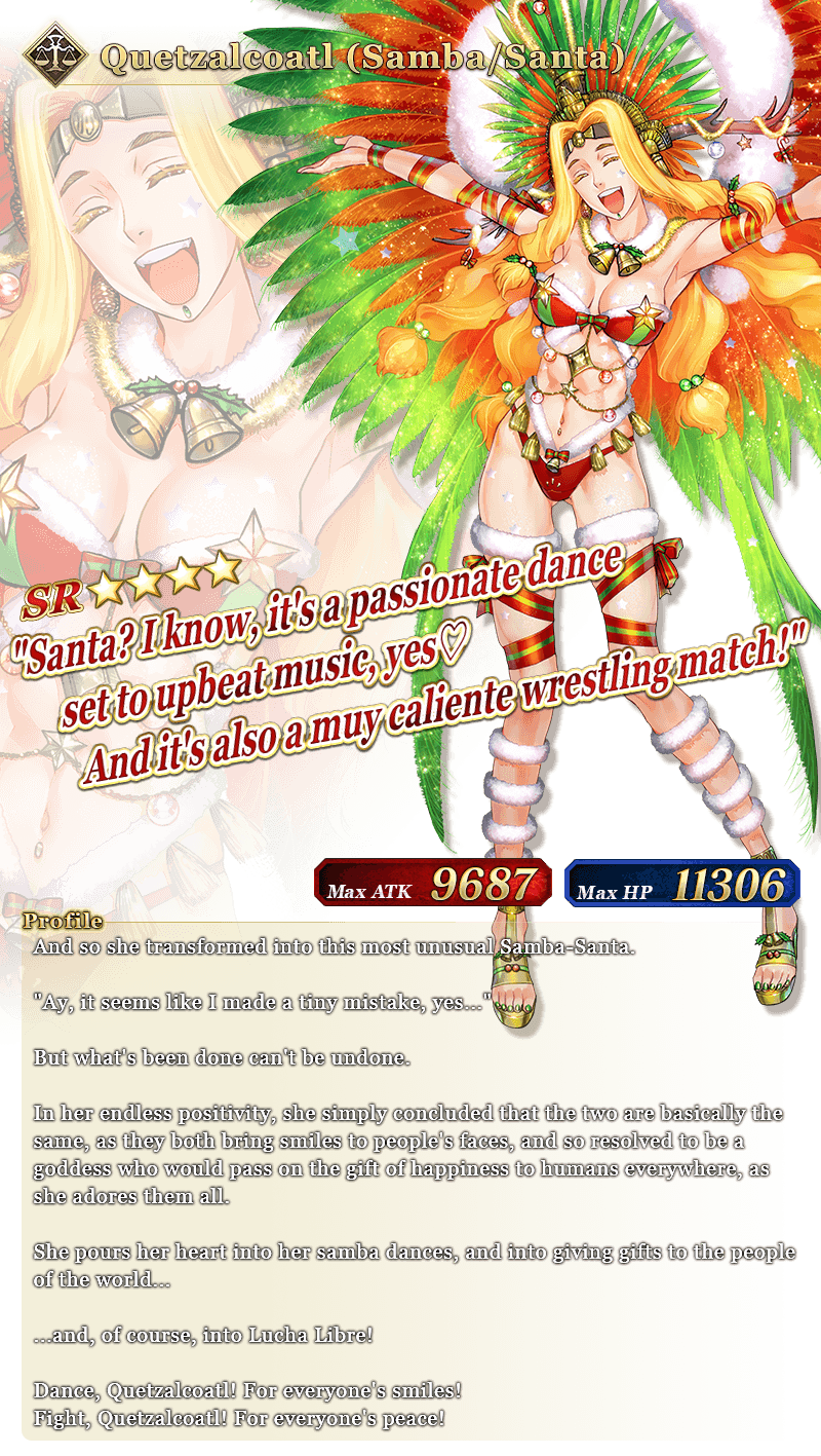 See "★4 (SR) Quetzalcoatl (Samba/Santa)" in action on Youtube, where we're sharing exclusive videos of the normal and Simple Spiritron Dress "Técnica Máscara" versions of her Noble Phantasm!