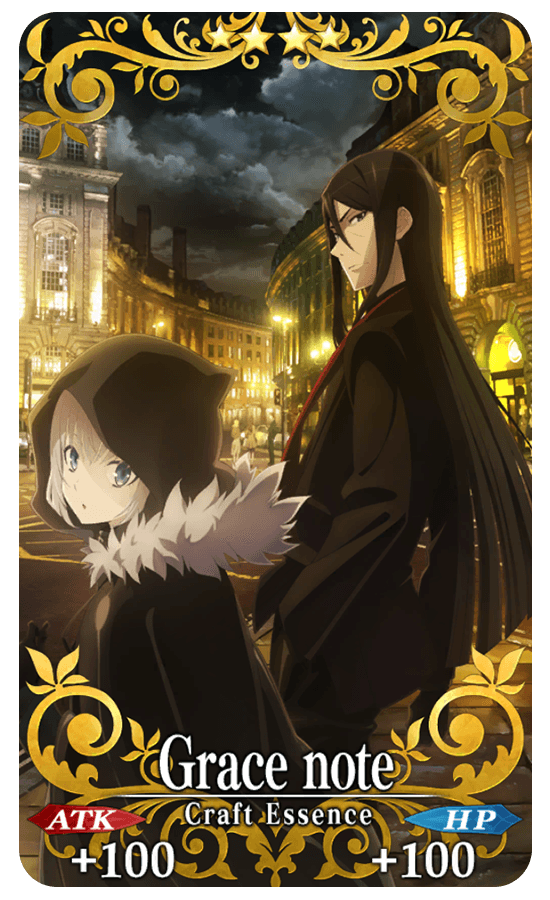 ★★★★SR Grace note ATK 100 (MAX: 100) HP 100 (MAX: 100) Skill When a quest is completed, increase the amount of Mystic Code EXP gained by 50 |