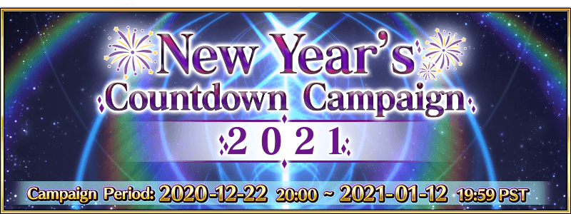 A New Year’s Countdown Login Bonus will be available. Log in nine times (once a day) during the period below to receive a maximum of six Golden Fruit and three Silver Fruit! Login Bonus Period: 2020-12-22 20:00 - 12-31 19:59 PST Eligibility: Masters who have cleared "Singularity F: Flame Contaminated City, Fuyuki" by 2020-12-30 19:59 PST will be eligible for the login bonus. * The "CLEAR" icon must be displayed on the quest banner in the Terminal by the above date in order to be considered eligible. |